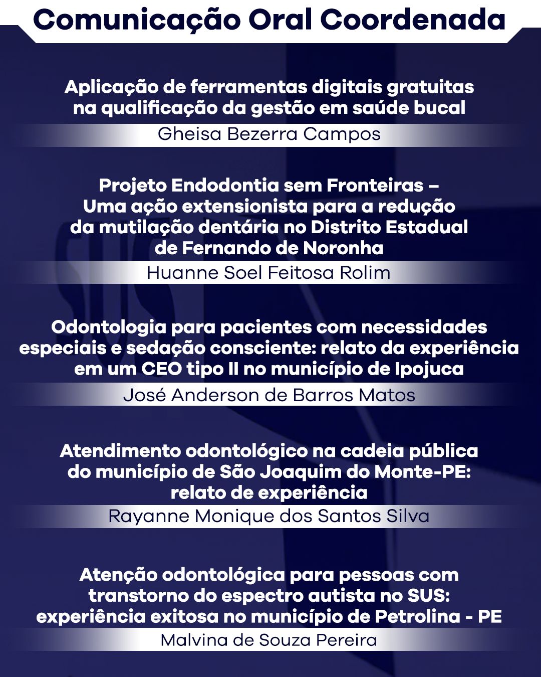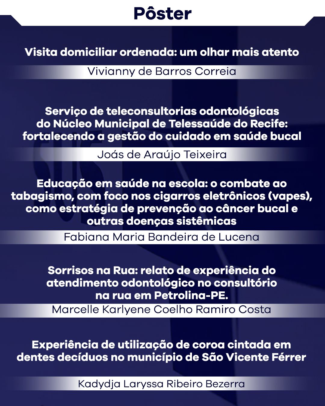 O Conselho Regional de Odontologia de Pernambuco (CRO-PE) anunciou os dez trabalhos finalistas da IV Mostra de Experiências Exitosas da Odontologia no Sistema Único de Saúde (SUS). Foram selecionados cinco trabalhos na modalidade Pôster e cinco na modalidade Comunicação Oral Coordenada, todos reconhecidos pelo caráter inovador e pelas contribuições para a promoção da saúde bucal no serviço público.