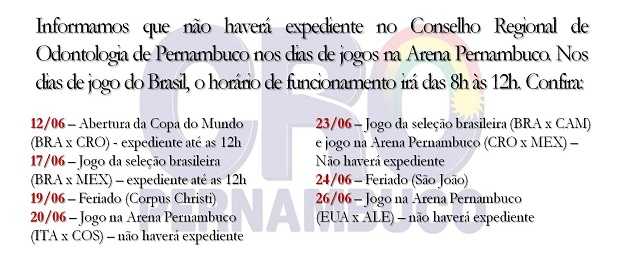 Informamos que não haverá expediente no Conselho Regional de Odontologia de Pernambuco nos dias de jogos na Arena Pernambuco. Nos dias de jogo do Brasil, o horário de funcionamento irá das 8h às 12h. Confira: