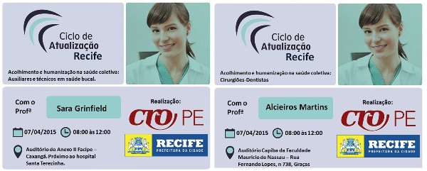Na próxima terça-feira, 07 de abril, o Conselho Regional de Odontologia de Pernambuco (CRO-PE) estará promovendo duas atividades no Ciclo de Atualização 2015. Em parceria com a Prefeitura do Recife, a palestra "Acolhimento e humanização na saúde coletiva: Auxiliares e técnicos em saúde bucal" será ministrada pela Professora Sara Grinfield no Auditório da Facipe e será voltada para a reciclagem dos ASBs e TSBs. Já a Professora Alcieiros Martins estará no Auditório Capiba, na Faculdade Maurício de Nassau, com a palestra "Acolhimento e humanização na saúde coletiva: Cirurgiões-Dentistas". Ambas são gratuitas e serão das 8h às 12h. Confira maiores informações: